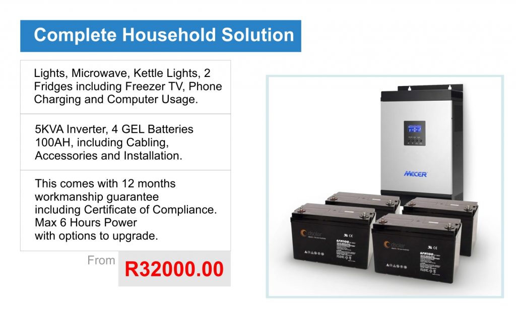 Solar Power Solutions will help you to provide power through those difficult load shedding hours and other unplanned power failures. No noise, no petrol/diesel, no fumes. Seamless, instant, 100% automatic backup power.